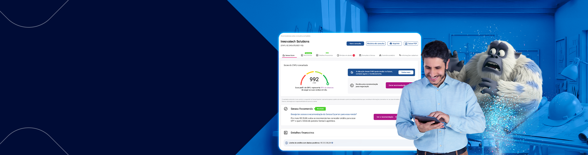 Se a resposta for sim, está na hora de contar com o Serasa Recomenda. Nossa solução vai além das consultas de crédito tradicionais, fornecendo um relatório completo e estratégico para decisões mais seguras.btenha uma avaliação detalhada do perfil de crédito do seu parceiro de negócios. Com base no histórico financeiro completo da pessoa ou empresa, o Serasa Recomenda oferece uma análise precisa do risco envolvido na negociação e sugere o limite de crédito adequado para essa transação.